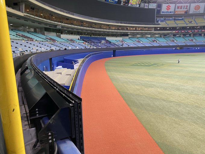 #バンテリンドームナゴヤ に新設されるテラス型観客席 #ホームランウイング の工事が9日、報道陣に公開されました。1月下旬の公開時には骨組みが見えていたフェンスにはラバーが全て張られていたほか、ウオーニングゾーンには #ミズノ 製の環境にやさしい人工芝が。進捗率は75%。#中日ドラゴンズ pic.twitter.com/ImmFCDM5hz