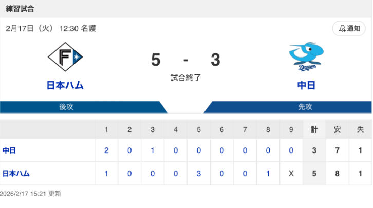 【試合結果】中日 3-5 日本ハム 三上が今日もマルチ&鵜飼が実戦第1号HR!櫻井・根尾が無失点投球!