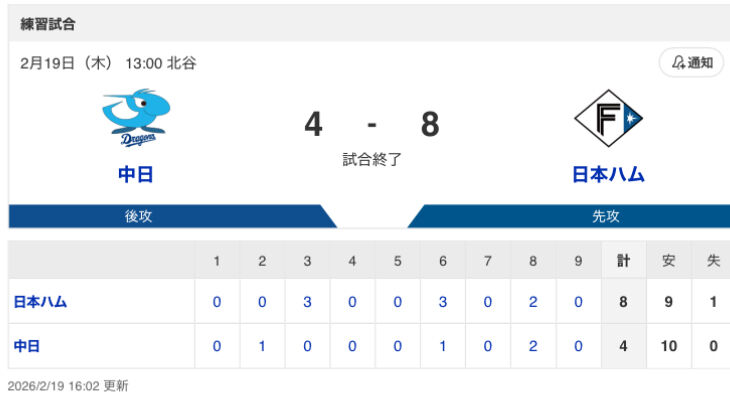 【試合結果】中日 4-8 日本ハム 柳・牧野・近藤・勝野が無失点!鵜飼がマルチ&サノ初ヒット&ボスラーが1号HR!
